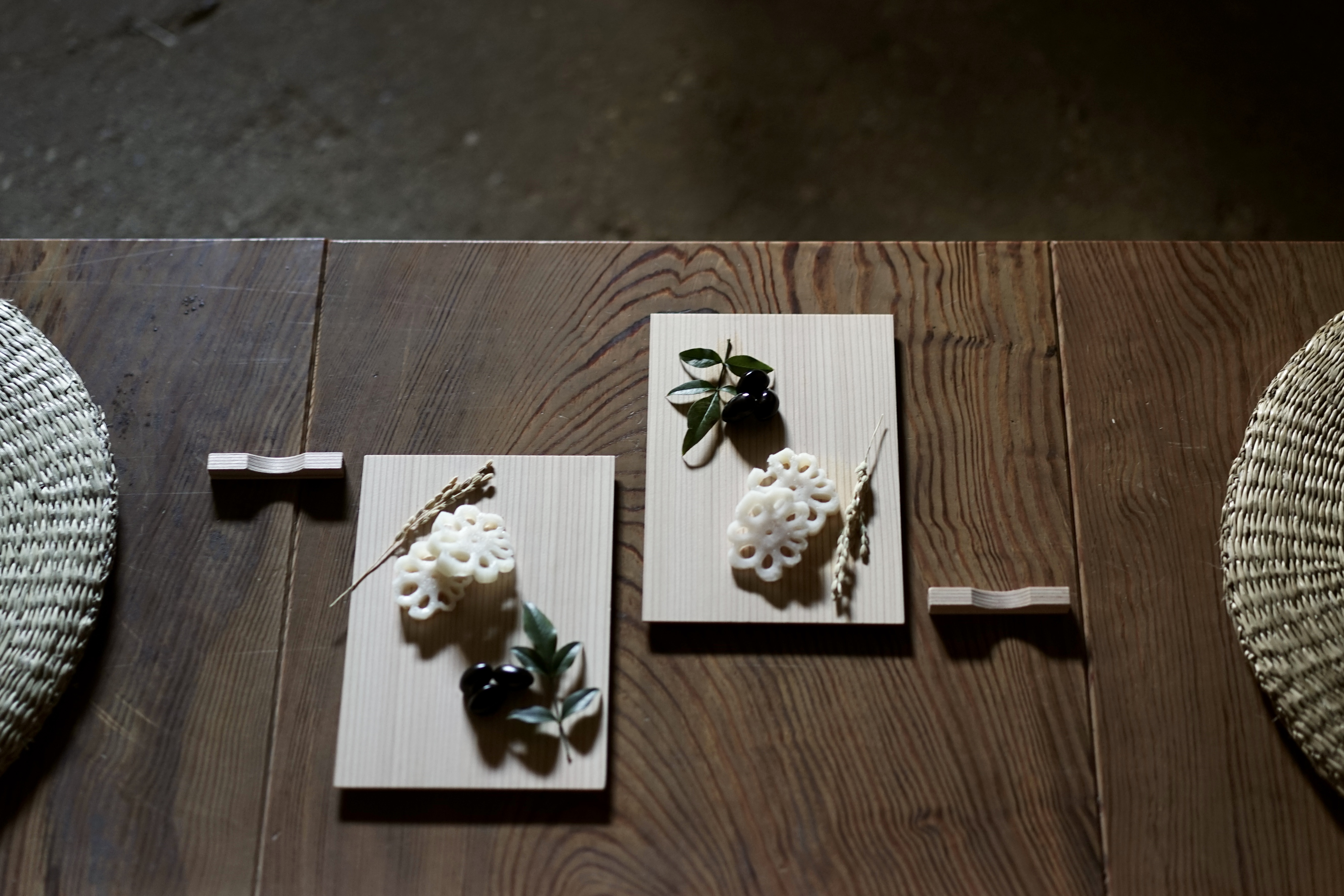 山野での植物採取に欠かせない「野冊」。古くから竹や板で植物を挟み、持ち歩くための用具として使われてきました。その野冊からイメージを膨らませた「あしらいかいしき」は二枚の杉板の間におせち料理に飾られる南天の葉や稲穂などを挟んだ簡素なものです。植物は切り分けて、杉板は向かい皿として、二枚の杉板の間に差し込まれている箸置きと一緒にお使いいただけます。新年を彩る草木のあしらいに野冊の遊び心を加えました。