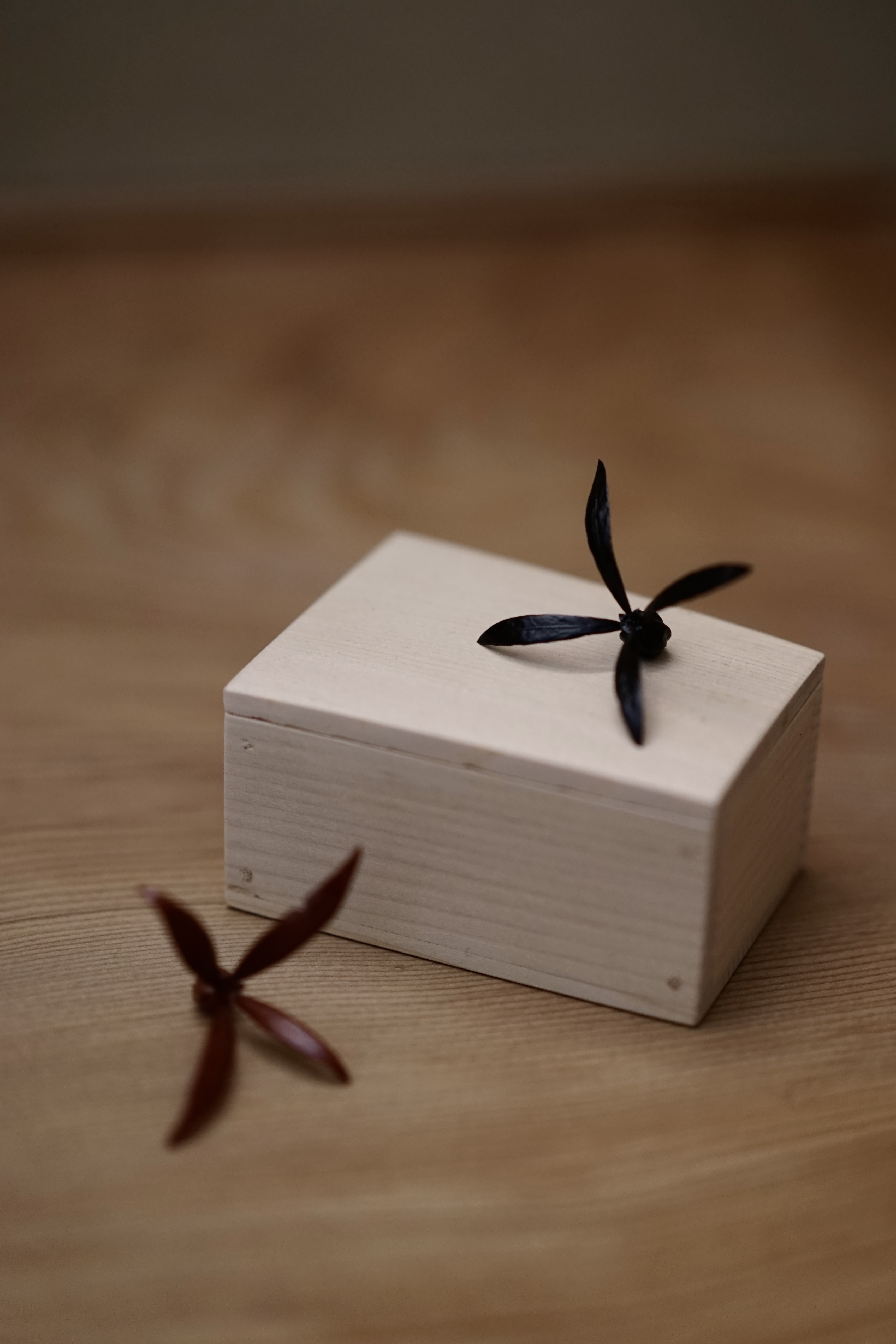 常磐木と松葉の茶色の対比で冬の京都の庭を飾る「敷松葉」を木箱におさめました。