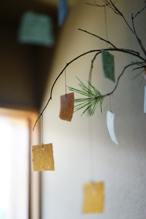 皮を落とした竹の白さに、若竹の繊維を漉き込んだ竹紙の組み合わせが美しい「竹炭包み」のお飾りです。