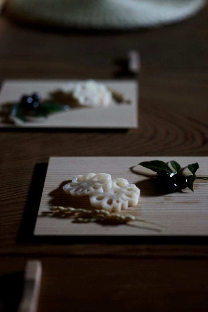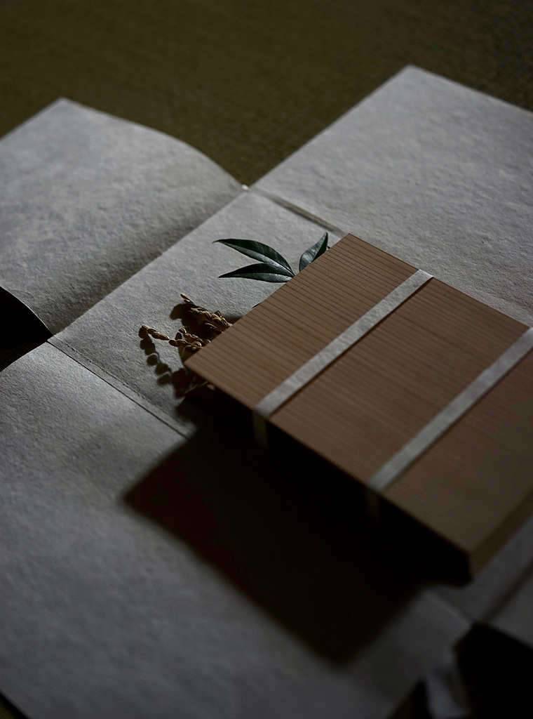 山野での植物採取に欠かせない「野冊」。古くから竹や板で植物を挟み、持ち歩くための用具として使われてきました。その野冊からイメージを膨らませた「あしらいかいしき」は二枚の杉板の間におせち料理に飾られる南天の葉や稲穂などを挟んだ簡素なものです。植物は切り分けて、杉板は向かい皿として、二枚の杉板の間に差し込まれている箸置きと一緒にお使いいただけます。新年を彩る草木のあしらいに野冊の遊び心を加えました。